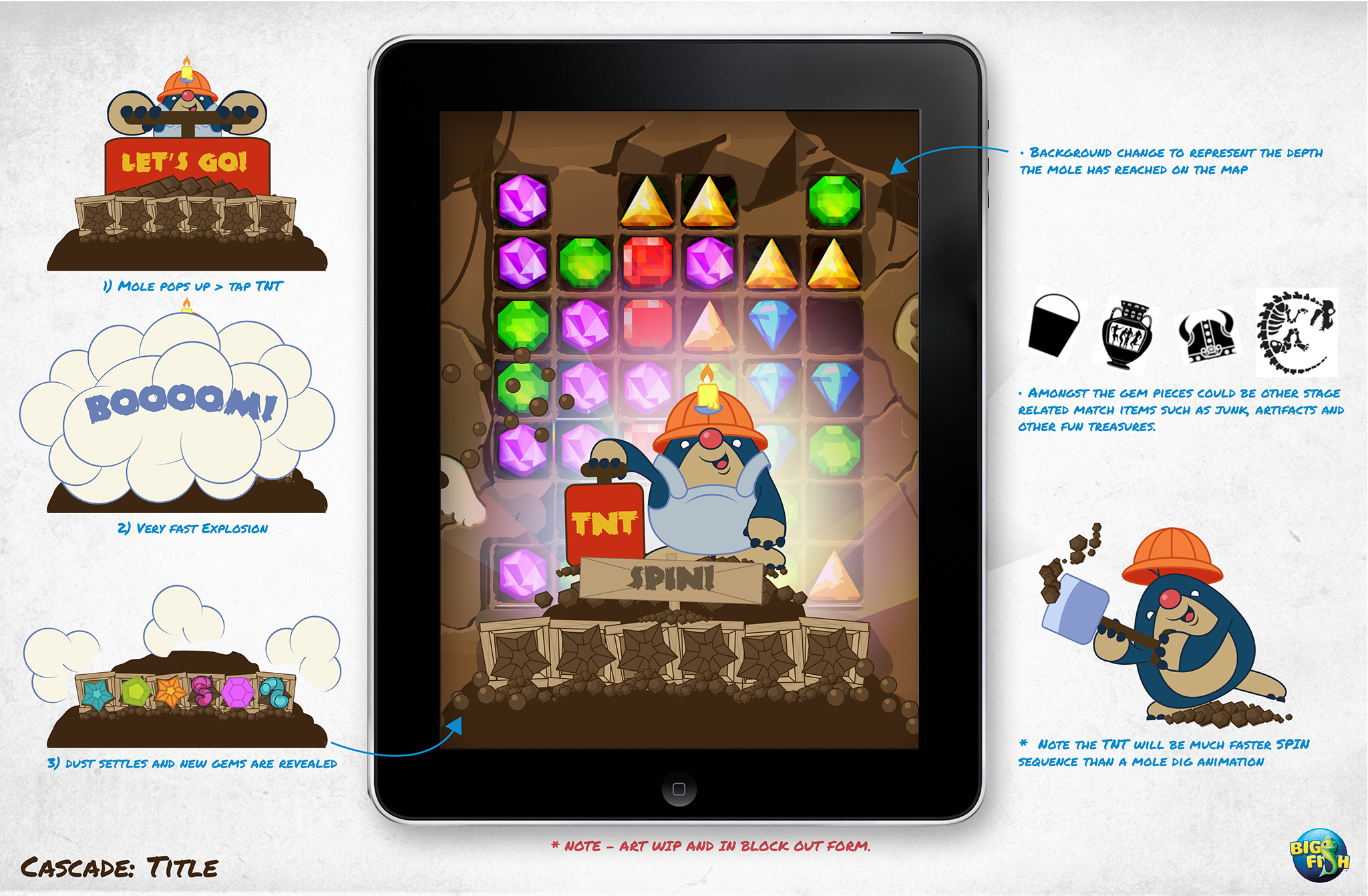 Cascade had a great game mechanic but it was struggling with it's art direction and premise. I was asked to quickly create a new visual concept. The result was an adorable little mole named Casper.
